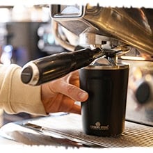 Our coffee cups are available in stylish colors: red wine, black and silver, and convenient capacities: 12 oz and 16 oz.